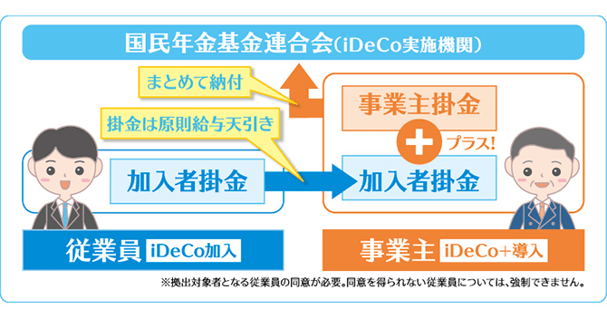 「iDeCo」は個人で始めることができますが、「iDeCo+」は企業が制度を導入しないと社員は利用できません。また、会社が導入していても、社員個人が利用を決めないと利用できません。つまり、「iDeCo+」は、企業と社員が二人三脚ですすめる制度なのです。まずは、会社として制度を導入し、社員が利用できる環境を作ることが重要です。