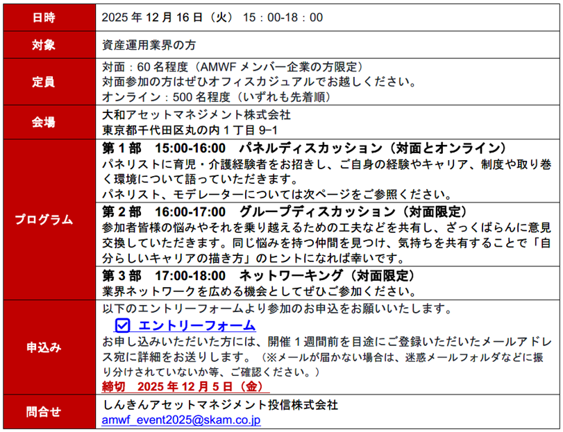 資産運用業界における女性活躍推進に向けて業界を横断した取組みを行うネットワーク「Asset Management Women's Forum(以下、AMWF)」は、年間を通じてジェンダーダイバーシティについて多様な角度から考えるイベントを開催しています。