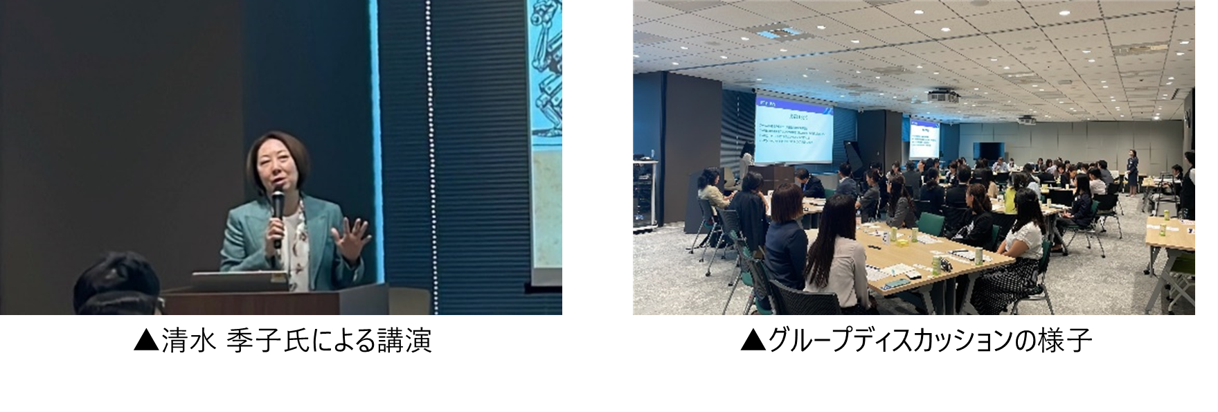 第一部では、講師として日本銀行で女性初の支店長、審議役、理事等を歴任され、現在は株式会社EmEcoを創業し女子学生のSTEM教育※2の拡充に取り組まれている清水季子氏による講演を行いました。国際会議での豊富な経験をもとに、急速に変化する現代社会におけるダイバーシティの重要性を力強く語っていただきました。また、日本における製造業が持つポテンシャルについても触れられました。「ダイバーシティを推進するためには男女双方の覚悟が必要」とのメッセージは参加者の心に届き、「もっと話を聞いてみたかった」「ダイバーシティは成長のための必須条件というメッセージが響いた」といったポジティブな感想が寄せられました。事後アンケートでは9割以上の参加者から満足との回答が得られました。